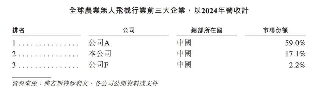 据弗若斯特沙利文,极飞在全球以及中国的农业无人机市场中位列第二,2024年市占率分别为17.1%和20.8%,但行业龙头大疆在农业无人机领域市占率超过50%,形成明显的规模与品牌优势。