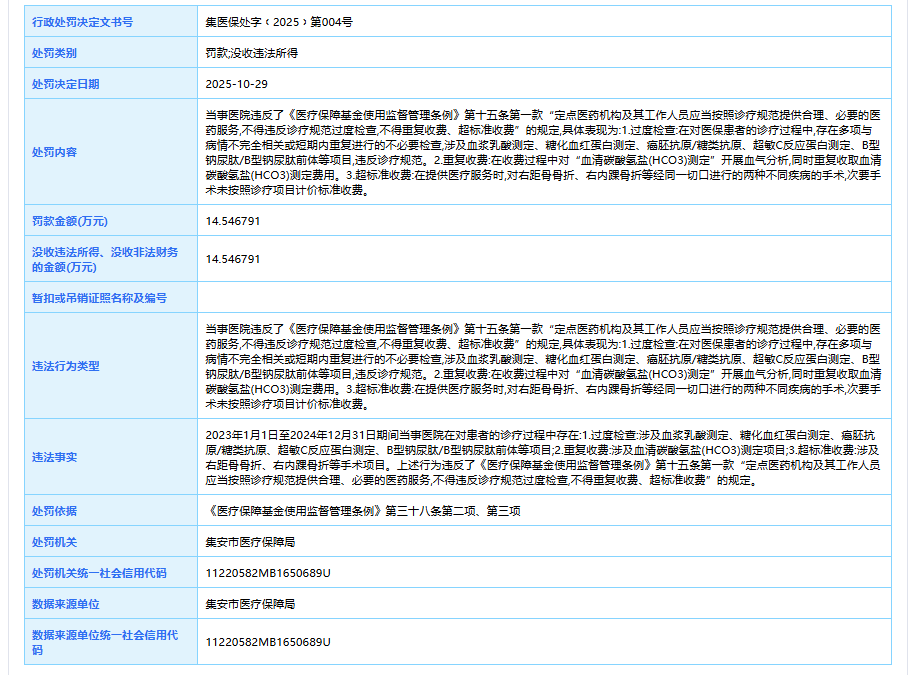 经查,2023年1月1日至2024年12月31日期间,该医院在对患者的诊疗过程中存在过度检查、重复收费、超标准收费等违规行为。违反了《医疗保障基金使用监督管理条例》,被依法没收违法所得14.546791万元,罚款14.546791万元。返回搜狐,查看更多