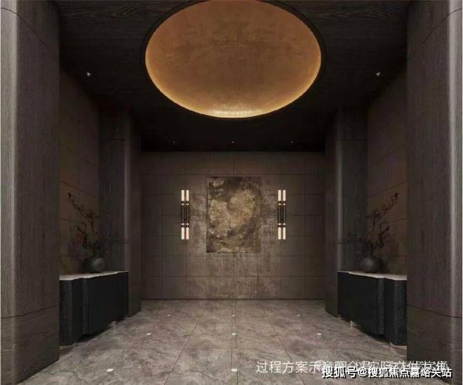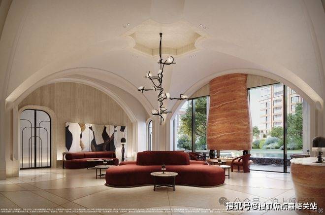约50m面宽的气派门头+酒店式入户大堂:打造艺术格调归家.入户大堂由吴滨设计,呈现“天圆地方”的效果,方正的线条勾勒出空间的规整与大气,与顶部的圆形形成刚柔并济的视觉平衡,让每一次归家都成为一场尊贵的礼遇.