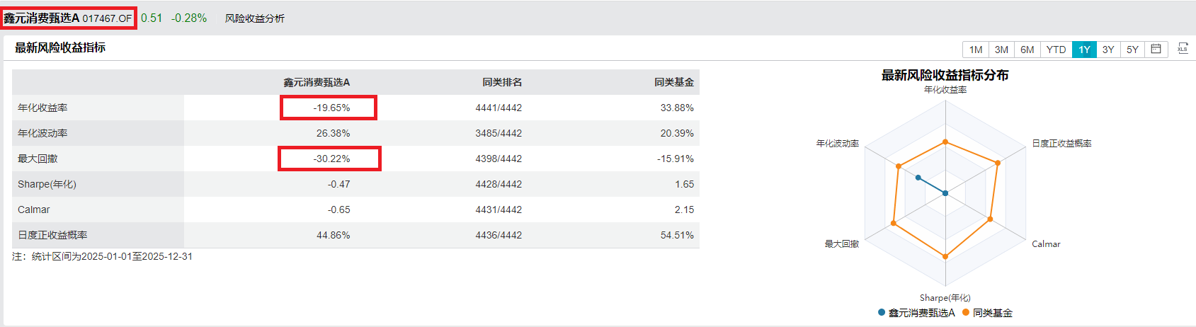 与此同时,我们看向榜单的另一端。鑫元消费甄选A,全年回报率为-29.65%,而最大回撤是多少?-30.22%。