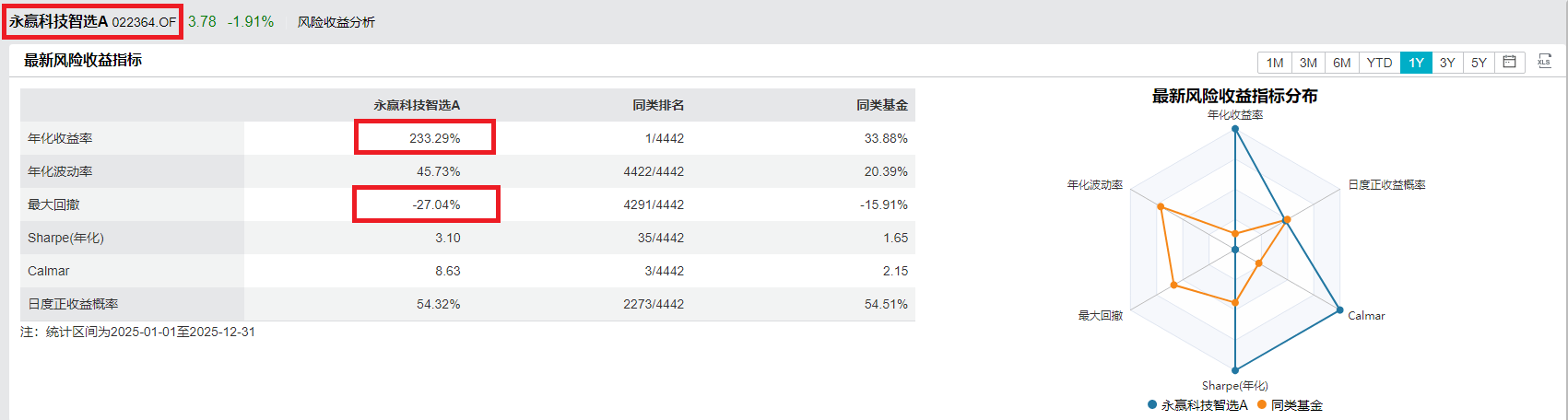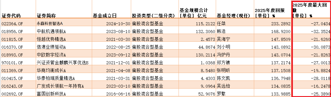 追浪先带各位客官看一组对比数据,根据Wind数据统计,2025年回报率位居榜首的永赢科技智选A,其年度回报达到了惊人的233.29%,最大回撤为-27.42%。