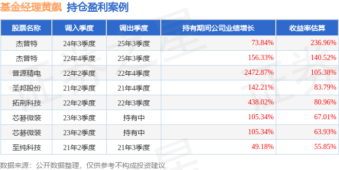 重仓股调仓示例详解: 1、杰普特(688025)翻倍案例: 黄飙管理的金信优质成长混合A基金在24年3季度买入杰普特,在持有1年又0个季度后在25年3季度卖出。持有期间的估算收益率为236.96%,持有期间杰普特在2024年到2025年的中报归属净利润增幅达73.84%。 2、圣邦股份(300661)调仓案例: 黄飙管理的金信深圳成长混合A基金在21年2季度买入圣邦股份,在持有2个季度后在21年4季度卖出。持有期间的估算收益率为83.79%,持有期间圣邦股份在2020年到2021年的年报归属净利润增幅达142.21%。 3、东富龙(300171)折戟案例: 黄飙管理的金信深圳成长混合A基金在22年1季度买入东富龙,在持有2年又3个季度后在24年4季度卖出。持有期间的估算收益率为-64.48%,持有期间东富龙在2022年到2024年的年报营业总收入降幅为8.4%。